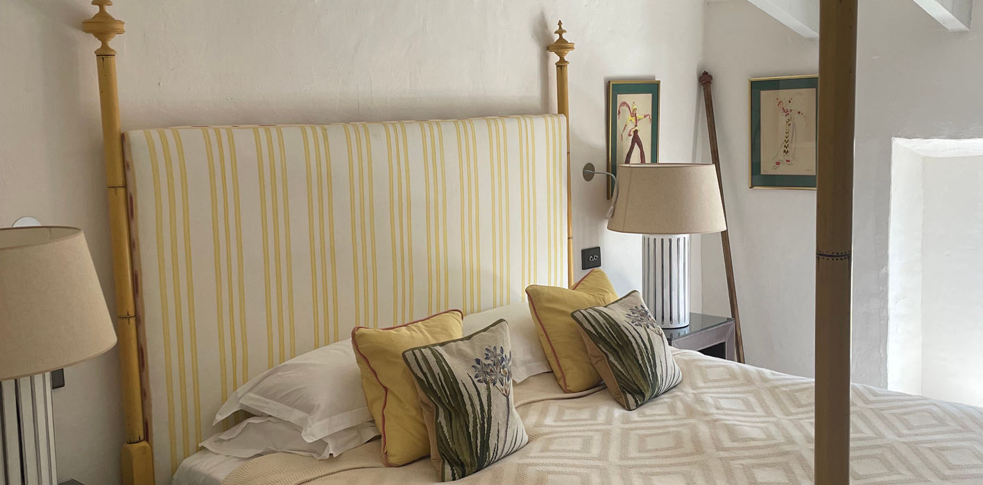 The interior design of Ca’an Soler has been created by the owners and we have used local builders and artisans. There are fabrics made in Majorca in the town of Santa Maria and Bennison fabrics from Chelsea. There are Indian bedspreads, Frette sheets and art and objects d’art collected by us from around the world over many years. There is art on the walls from most parts of the world… Bali, Zimbabwe, Scotland, Provence, photography from Malta and local artist Carlos Espiro’s city and country ‘scapes from Majorca. There are even a couple of finds from the railings at Hyde Park from the days when some serious artists used to exhibit on a Sunday. Additional ‘Moroccan’ arches and colours have been inspired by Yves Saint Laurent’s homes in Morocco and have been re-created by Moroccan artisans living in Majorca.